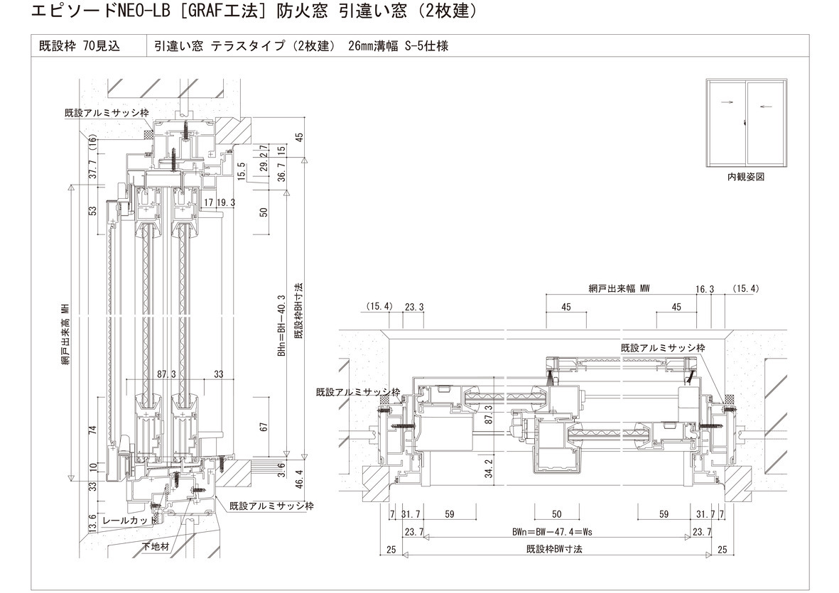 エピソードNEO-LB[GRAF工法] 防火窓 既設枠 70見込 引違い窓 テラスタイプ(2枚建) 26mm溝幅 S-5仕様