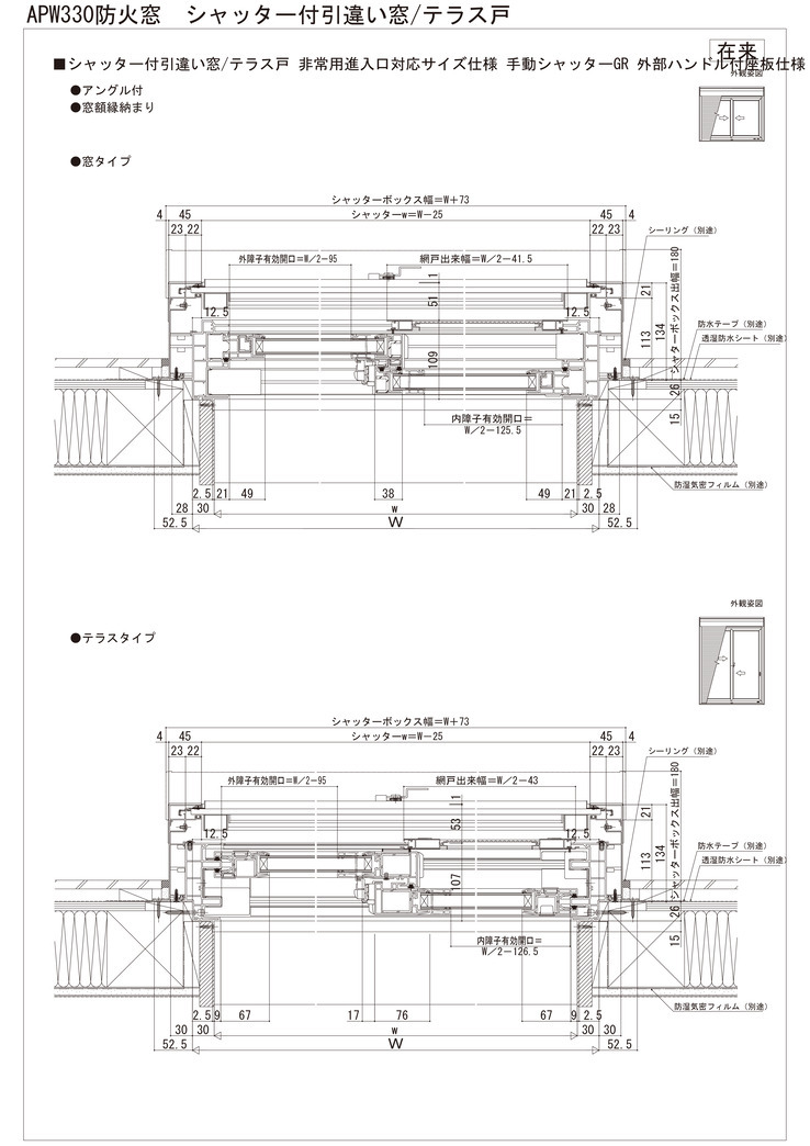 在来 APW330/APW331 防火窓 シャッター付引違い窓/テラス戸 非常用進入口対応サイズ仕様 手動シャッターGR 外部ハンドル付座板仕様 アングル付 窓額縁納まり 窓タイプ